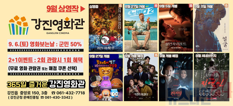 오는 9월 6일 토요일에도 ‘영화 보는 날’을 운영하며, 강진군민 관람료 50% 할인을 이어갈 예정이다. 실제로 지난 6월부터 이어져 온 ’영화 보는 날‘ 행사에는 700여 명이 참여해 꾸준한 사랑을 받고 있다.