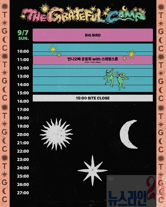 둘째 날 (9월 6일) 오후에는 슈가석율과 플로랄 테크닉스의 ‘쑨콤의 댄스홀타임’, 박문치가 이끄는‘파워 에어로빅 클래스’로 에너지를 끌어올린다. 특히, 무대 한가운데에서 펼쳐지는 이색적인 프로레슬링 매치 ‘THE GRATEFUL CLASH TOURNAMENT’는 현장을 뜨겁게 달굴 예정이다.