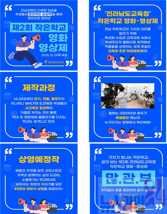 한편, ‘제2회 작은학교 영화·영상제’ 공모전 관련 접수 방법과 세부 안내 사항은 전라남도교육청 누리집 공고·고시란에서 확인할 수 있다.