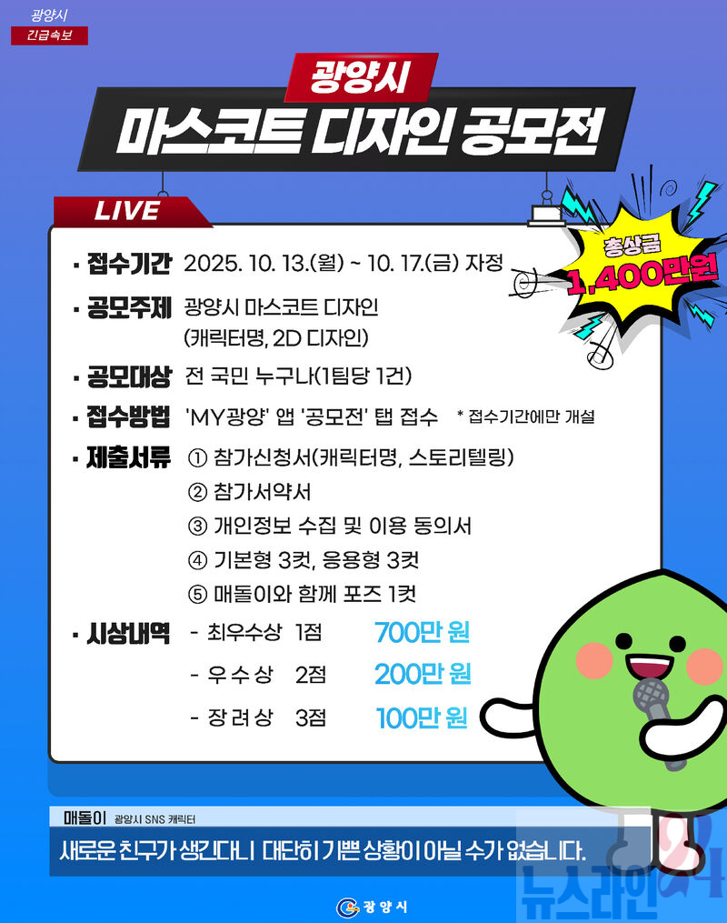 심사는 시민 선호도 조사 50%와 전문가 심사 50%를 합산해 진행된다. 총상금은 1,400만 원으로, 최우수상 700만 원(1점), 우수상 각 200만 원(2점), 장려상 각 100만 원(3점)이 수여된다. 결과는 11월 25일 ‘MY광양’ 앱과 광양시 누리집에 공지되며, 개별 통보도 이뤄진다. 선정된 작품은 향후 광양시 공식 마스코트 운영에 활용될 예정이다.
