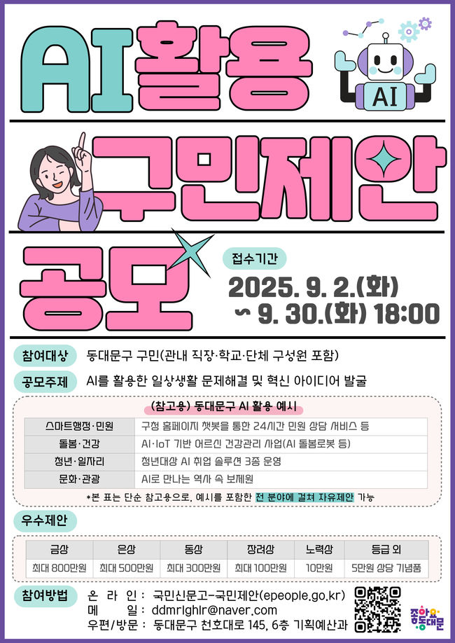 동대문구, ‘AI 구민제안 집중공모’ 실시…최대 800만 원 시상 교통·복지·안전·환경·문화 등 생활 전반 아우르는 AI 활용 아이디어 공모 9월 2일부터 30일까지 접수…구민·직장인·학생 등 누구나 참여 가능 금상 수상자에 구청장 표창 및 500만~800만 원 시상금 수여