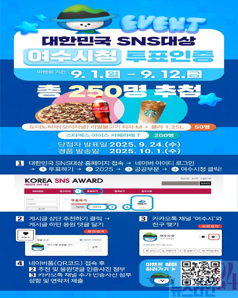 여수시(시장 정기명)가 ‘2025 대한민국 SNS 대상’ 10년 연속 수상을 목표로 오는 12일까지 전 국민을 대상으로 온라인 투표 이벤트를 진행하고 있다.