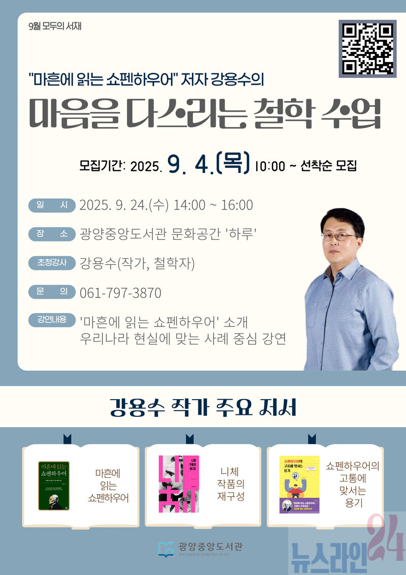광양중앙도서관은 9월 24일 오후 2시 문화공간 ‘하루’에서 「모두의 서재」 세 번째 강연을 개최한다. 이번 강연에는 철학자이자 작가인 강용수가 초청돼 ‘마음을 다스리는 철학 수업’을 주제로 시민들과 만난다.