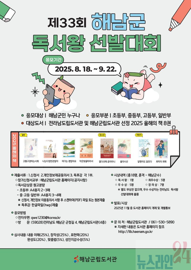 이번 대회는 초등부, 중등부, 고등부, 일반부로 나뉘어 진행된다. 참가자는 전라남도립도서관 및 해남군립도서관에서 선정한 2025 올해의 책 8권 중 부문에 맞게 도서를 읽고 독후감을 작성해 제출하면 된다.