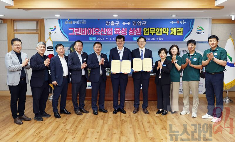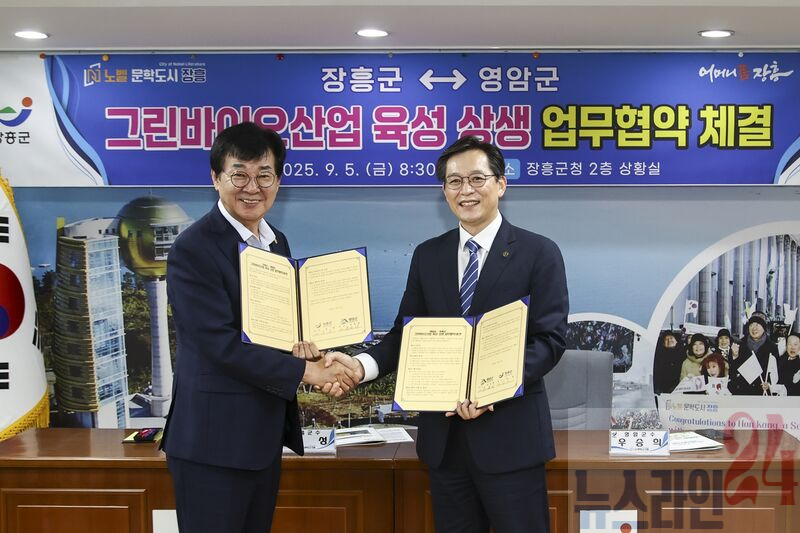 영암군(우승희 군수)과 장흥군(김성 군수)이 손을 맞잡고 그린바이오산업 육성을 위한 상생 협력에 나섰다. 양 군은 지난 5일 장흥군청에서 업무협약을 체결하고, 지역이 보유한 자원과 인프라를 연계해 지속 가능한 농업생명산업 발전과 지역 균형발전을 함께 도모하기로 했다.