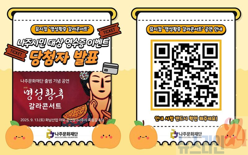 김찬동 나주문화재단 대표이사는 “무료 좌석 이벤트에 보내주신 시민들의 열띤 관심에 감사드린다”며 “안전하고 쾌적한 공연 관람을 위해 사전에 반드시 공연장 위치와 주차 안내를 확인해 주시길 바란다”고 당부했다.