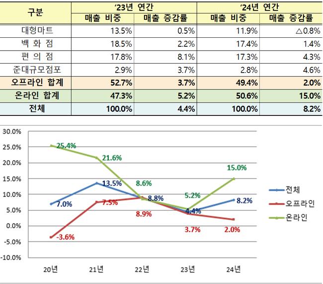 2024년 유통업계 매출 8.2% 증가…온라인 매출 15% 급성장 오프라인 매출 2% 소폭 증가, 온라인 15% 상승하며 두 자릿수 성장 편의점 꾸준한 성장세…온라인은 식품·서비스 중심으로 매출 확대