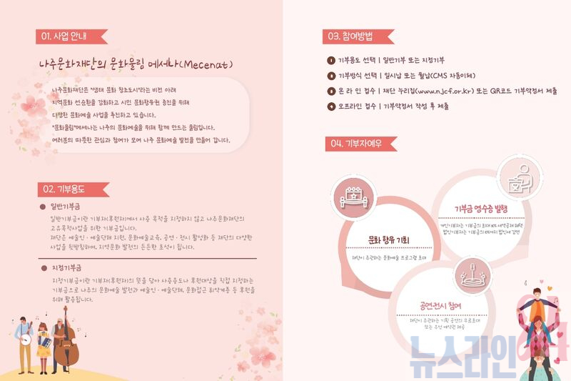 재단은 온라인 기부 접수 시스템을 재단 누리집www.njcf.or.kr)에 마련해 시민, 기업, 단체 누구나 간편하게 문화예술 기부에 동참할 수 있도록 접근성을 높였다.