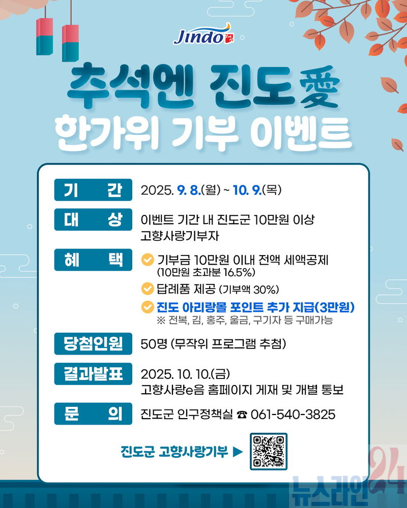 진도군이 추석을 맞아 고향사랑기부제의 확산을 위해 9월 8일부터 10월 9일까지 한 달간, ‘추석엔 진도愛 한가위 기부 이벤트’를 추진한다고 밝혔다.
