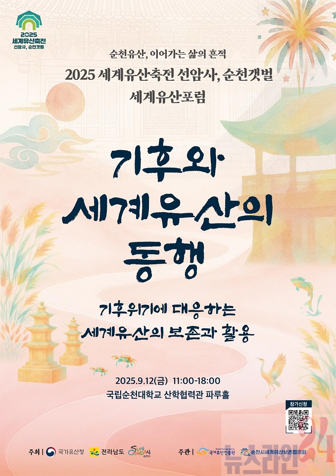 순천시(시장 노관규)와 순천시 세계유산보존협의회(위원장 김준선)는 기후변화에 따른 세계유산 보존․활용의 우수사례 및 정책을 공유하기 위해 세계유산포럼 ‘기후와 세계유산의 동행’을 오는 12일 11시 순천대학교 파루홀에서 개최한다고 밝혔다.