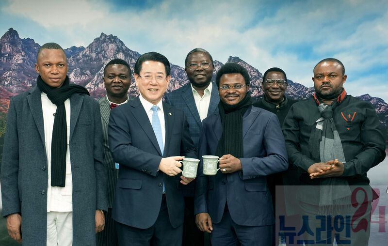 김영록 전라남도지사가 23일 도청 접견실에서 콩고민주공화국 렌돈콜리아 레바봉가 폴랭 초포주지사와 기념품을 교환하고 기념촬영을 하고 있다.