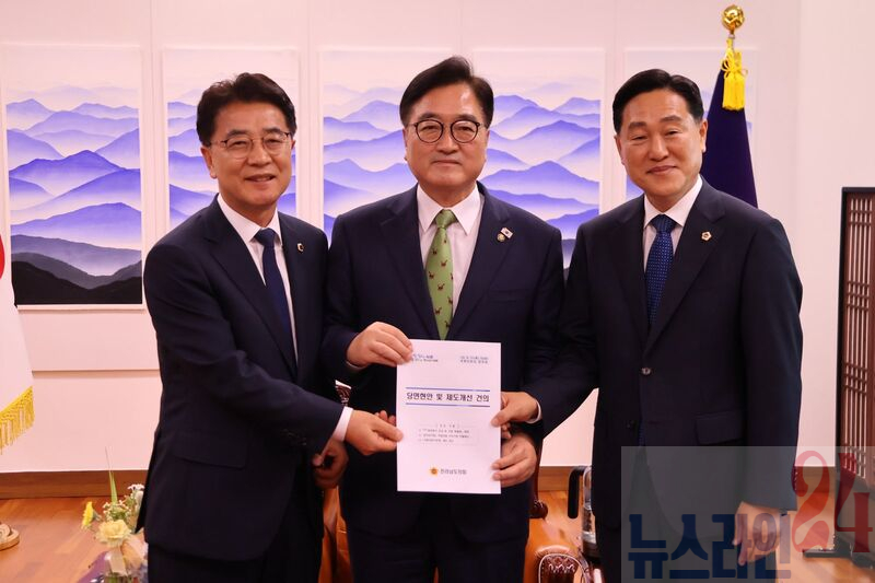 전라남도의회 김태균 의장은 강문성 기획행정위원장과 함께 11일 국회를 방문해 우원식 국회의장을 접견하고, 청년 인구 유출과 지역경제 침체, 지방의원 사직기한 차별 문제 해소 등 현안 해결을 위한 제도 개선과 국회 차원의 지원을 강력히 요청했다.
