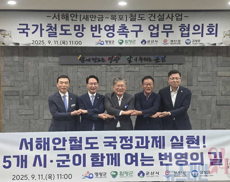 12일 함평군에 따르면 전남 함평군·영광군, 전북 군산시· 부안군·고창군 등 서해안 5개 시군이 함께 지난 11일 ‘서해안철도 국가철도망 반영촉구 업무 협의회’를 개최하고 국가철도망 구축계획 반영과 조기 건설을 위해 공동 대응하기로 했다.
