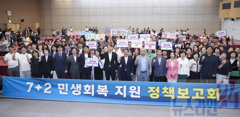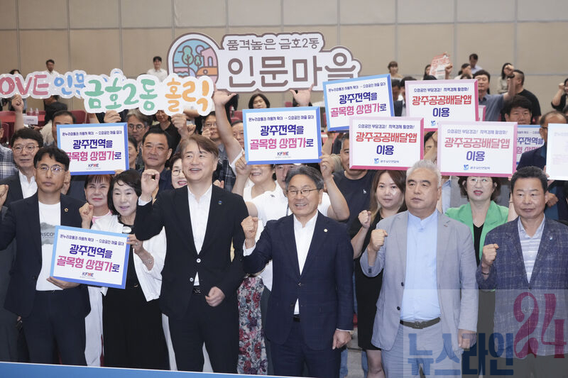 강기정 광주광역시장이 지난 7월23일 오전 서구 김대중컨벤션센터에서 열린 '7+2 민생회복 지원 정책보고회'에 참석해 시, 자치구, 유관기관 등 참석자들과 기념촬영을 하고 있다. 이날 보고회에서는 보고회에서는 광주시와 자치구, 유관기관 등 12개 기관·단체가 ‘7+2 소상공인 지원 패키지’의 성공 추진을 위한 ‘골목형 상점가 광주전역 확대 업무협약(MOU)’을 체결했다. 광주시가 침체된 골목상권에 활력을 불어넣기 위해 ‘골목형상점가’ 지정을 확대하고 다양한 지원책을 추진하고 있다. 이는 정부와 지자체 지원 사업에 참여할 수 있는 기반을 넓혀 소상공인들에게 실질적인 도움을 주기 위한 것이다.