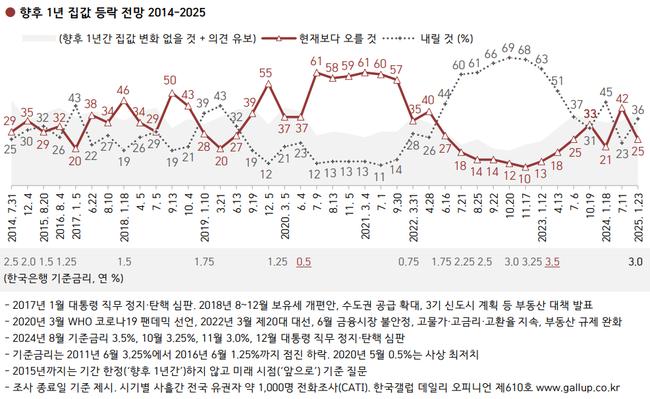 한국갤럽이 2025년 1월 21일부터 23일까지 전국 만 18세 이상 1,000명을 대상으로 집값 전망을 조사한 결과, 집값이 `하락할 것`이라는 응답이 36%로 가장 많았으며, `오를 것`이라는 응답은 25%에 그쳤다. `변화 없을 것`이라는 응답은 28%였고, 나머지 11%는 의견을 유보했다. 이는 작년 7월 상승론이 우위를 점했던 상황과 대비된다.