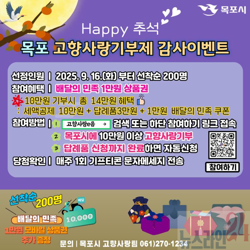 목포시는 민족 최대 명절인 추석을 맞아 16일부터 ‘고향사랑기부제 감사 이벤트’를 진행한다.