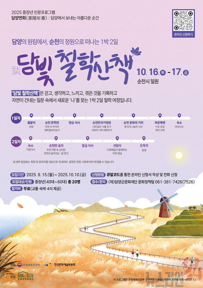 (재)담양군문화재단(이사장 정철원, 이하 재단)은 문화체육관광부와 한국문화예술위원회에서 후원하는 2025 중장년 인문 프로그램의 일환으로, 자연이 건네는 질문 속에서 새로운 ‘나’를 찾는 1박 2일 철학 여정 「담빛 철학산책–순천편」 참가자를 모집한다고 밝혔다.