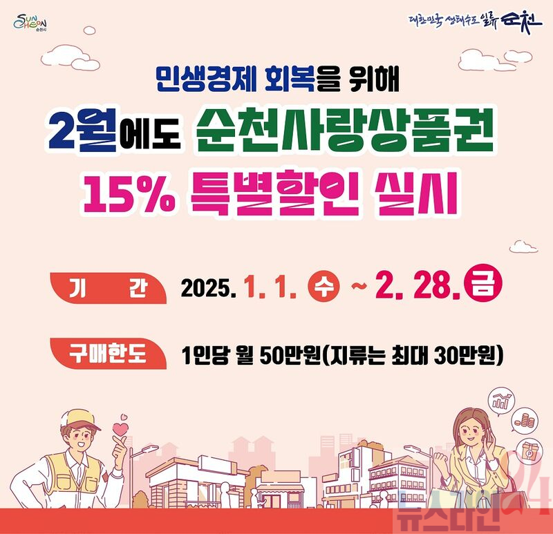 순천시(시장 노관규)가 민생경제를 살리고 지역 상권을 활성화하기 위해 1월 한 달간 실시할 계획이었던 순천사랑상품권 15% 특별할인을 2월 28일까지 연장한다고 밝혔다.