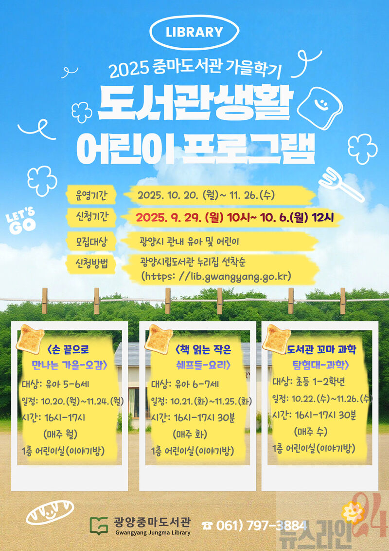 운영 강좌는 ▲유아 5~6세 대상 ‘손 끝으로 만나는 가을’ ▲유아 6~7세 대상 ‘책 읽는 작은 쉐프들’ ▲초등 1~2학년 대상 ‘도서관 꼬마 과학 탐험대’ 3개다.