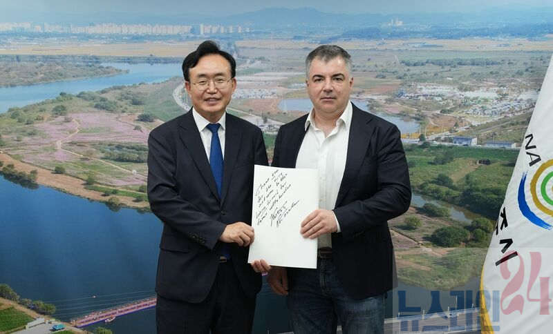 ‘나주글로벌에너지포럼 2025(NGEF 2025)’ 참가를 위해 나주를 방문한 2010년 노벨물리학상 수상자 콘스탄틴 노보셀로프 교수(싱가포르 국립대)가 16일 오후 나주시청을 방문해 윤병태 시장과 환담했다.