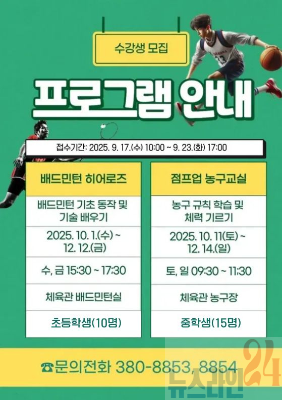 참여 희망자는 오는 17일 오전 10시부터 23일 오후 5시까지 회관 누리집(http://lib.gen.go.kr/gecs)을 통해 신청하면, 선착순으로 농구 15명, 배트민턴 10명 등 25명을 선정한다. 자세한 내용은 운영과(062-380-8853~4)로 문의하면 된다.