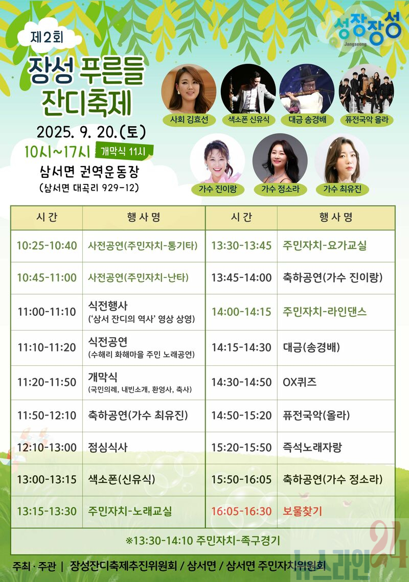 장성잔디축제위원회 이은수 위원장은 “삼서면이 자랑하는 명품 ‘장성 잔디’를 널리 알리고, 지역에도 활력을 더하는 소중한 기회가 될 것으로 기대한다”며 많은 방문을 당부했다.