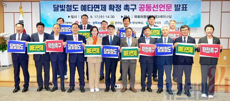 강기정 광주광역시장이 달빛철도가 경유하는 영·호남 시·도지사, 지역 국회의원들과 17일 국회에서 ‘달빛철도 예비타당성조사 면제 확정을 촉구하는 공동선언’을 발표했다. 강기정 광주광역시장, 김정기 대구광역시장 권한대행을 비롯한 6명의 시·도지사와 달빛철도 경유지역 국회의원들은 이날 국회 제3세미나실에서 기자회견을 열어 달빛철도 건설사업의 조속한 추진을 요구했다.