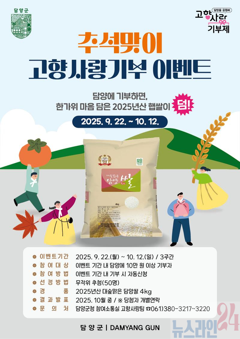 군 관계자는 “한가위를 맞이해 담양을 응원해 주시는 분들께 감사의 마음을 담아 이번 이벤트를 준비했다”며, “많은 관심과 참여를 부탁드리며, 앞으로도 건전한 기부 문화 확산에 앞장서겠다”라고 말했다.