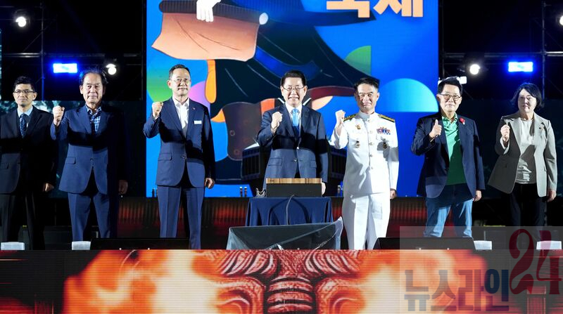 김영록 전라남도지사가 19일 해남 우수영관광지에서 열린 ‘2025 명량대첩축제 개막식’에 참석, 승전 장계를 낭독하고 있다.