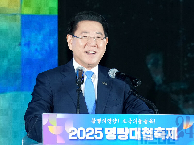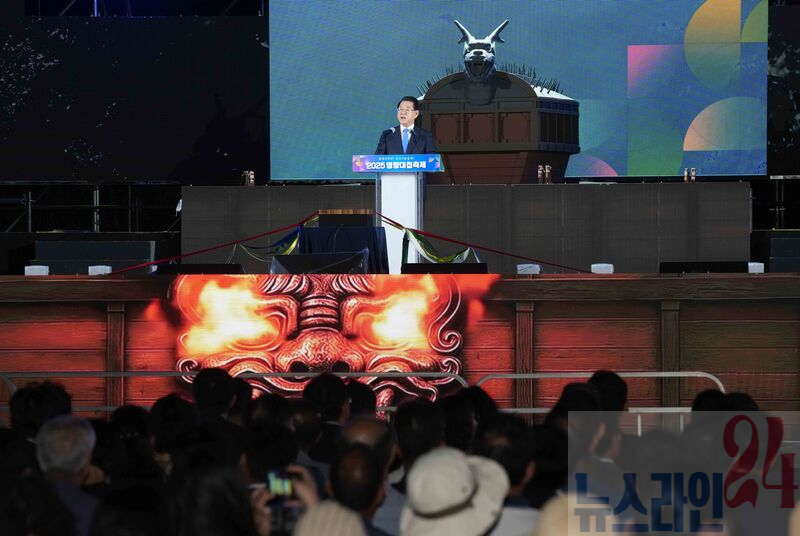 김영록 전라남도지사가 19일 해남 우수영관광지에서 열린 ‘2025 명량대첩축제 개막식’에 참석, 환영사를 하고 있다.