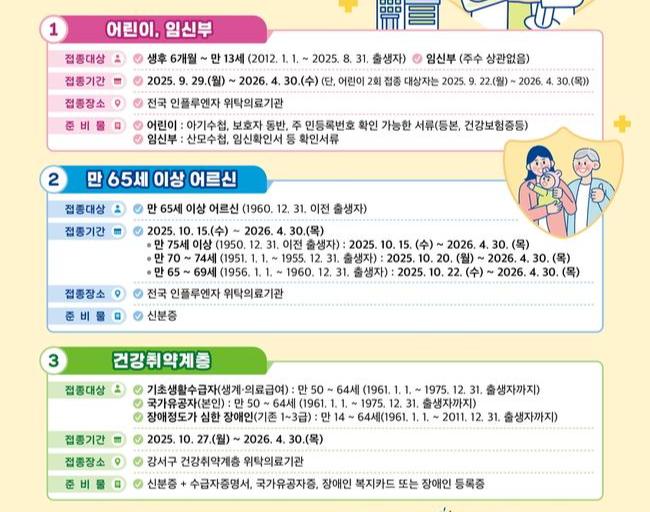 해당 접종은 강서구 건강취약계층 위탁의료기관에서 가능하며, 신분증 외에 장애복지카드, 수급자증명서, 국가유공자증 등 관련 서류를 지참해야 한다.