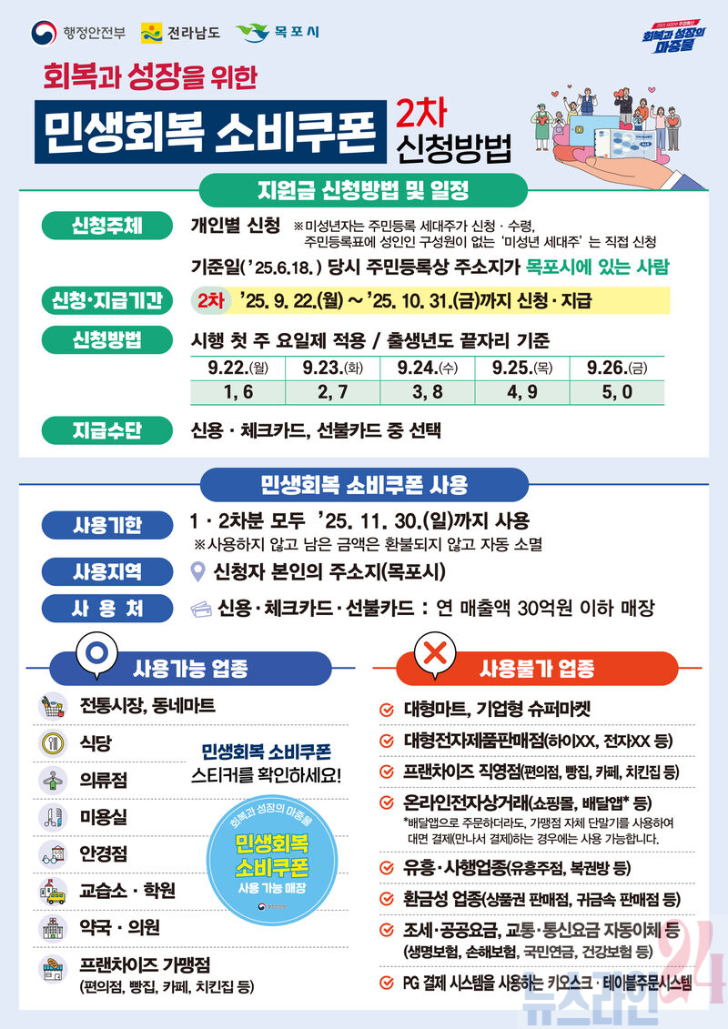 목포시가 9월 22일부터 민생회복 소비쿠폰 2차 지급을 시작한다.