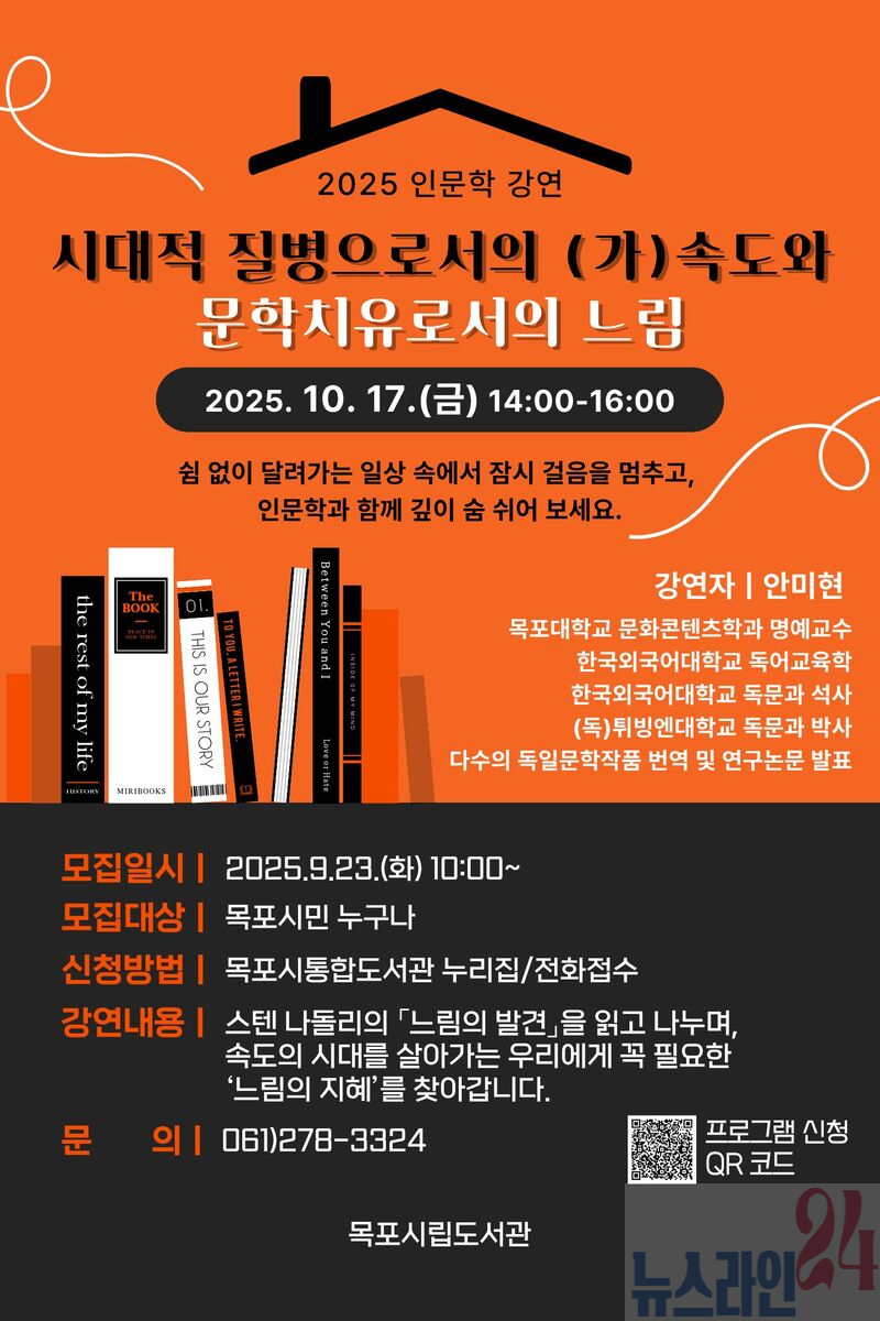목포시립도서관은 오는 10월 17일 오후 2시, 인문학 강연 ‘시대적 질병으로서의 (가)속도와 문학치유로서의 느림’을 진행한다.