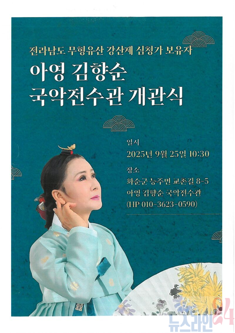 화순군(군수 구복규)은 오는 9월 25일(목) 전라남도 지정 무형유산(강산제 심청가)보유자 아영 김향순 국악전수관 개관식을 개최한다고 밝혔다.