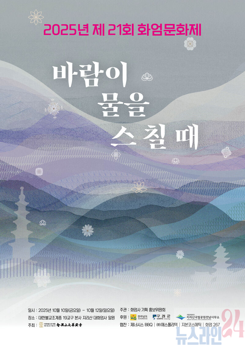 대한불교조계종 19교구 지리산 대화엄사 주지 우석스님은 “2025, 제21회 화엄문화제”를 10월 10일(금요일) - 10월 12일(일요일)까지 “바람이 물을 스칠 때”이라는 주제로 지리산대화엄사 경내에서 3일간 개최 한다고 21일 밝혔다.