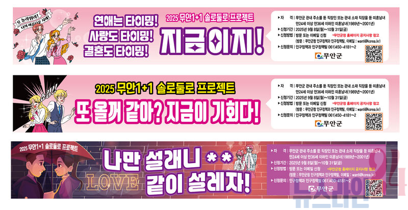 전남 무안군(군수 김산)이 올가을, 솔로 청춘들의 마음을 흔드는 핫 이벤트, 이름하여 ‘2025 무안 1+1 솔로둘로 프로젝트’를 다시 개최한다.