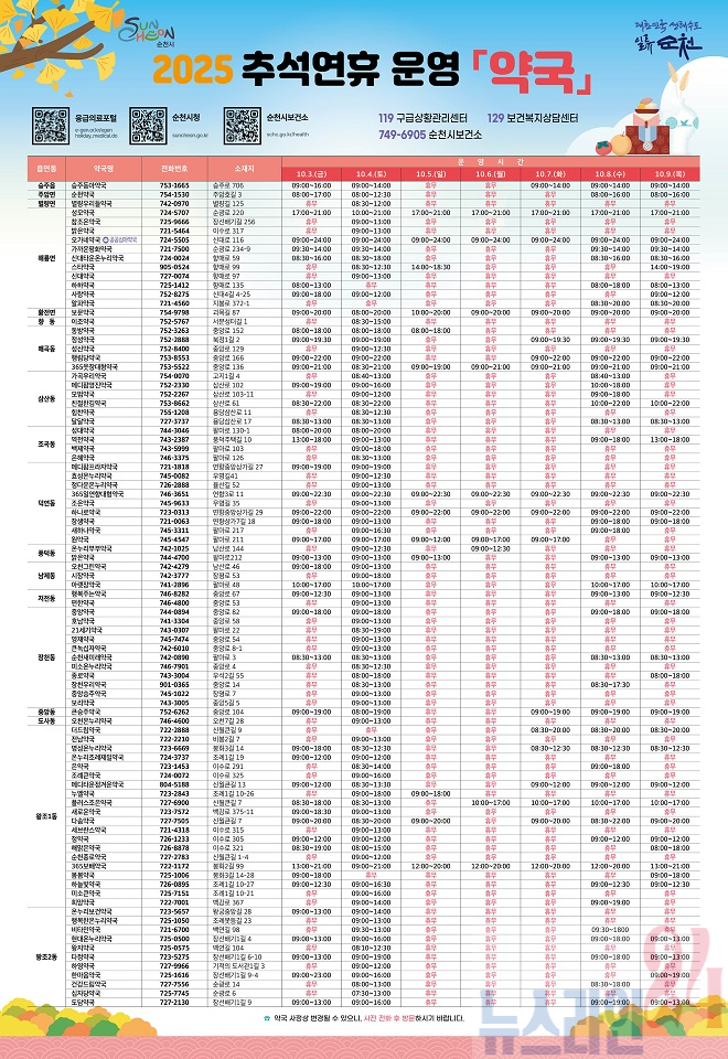 연휴 중 문을 여는 병·의원 및 약국 정보는 순천시·순천시보건소 누리집, 응급의료포털 E-gen에서 확인 가능하며, 인터넷 사용이 어려운 경우에는 보건소 응급진료 상황실(061-749-6905)로 문의하면 된다.
