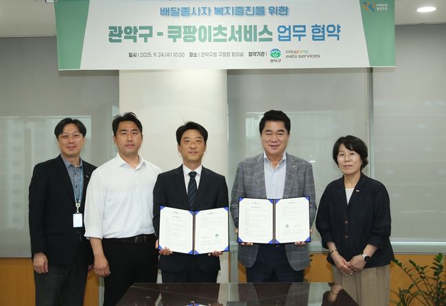 관악구(구청장 박준희)는 지난 9월 24일 구청에서 쿠팡이츠서비스와 ‘배달종사자 안전 및 복지 증진을 위한 업무협약(MOU)’을 체결했다고 밝혔다. 협약식에는 박준희 관악구청장과 강동진 쿠팡이츠서비스 상무이사 등 관계자 6명이 참석했다.