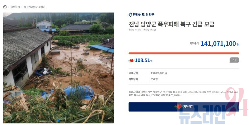 담양군(군수 정철원)은 지난 7월 특별재난지역 선포에 따라 추진한 고향사랑기부제 지정기부사업 ‘폭우피해 복구 긴급 모금’이 군민과 기부자의 동참 속에 목표액 1억 원을 조기 달성했다고 밝혔다.담양군은 집중호우 피해 지역의 신속한 복구와 주민들의 일상 회복을 돕기 위해 해당 모금사업을 고향사랑기부제 지정기부사업으로 선정하고 7월 25일부터 모금을 시작했다.