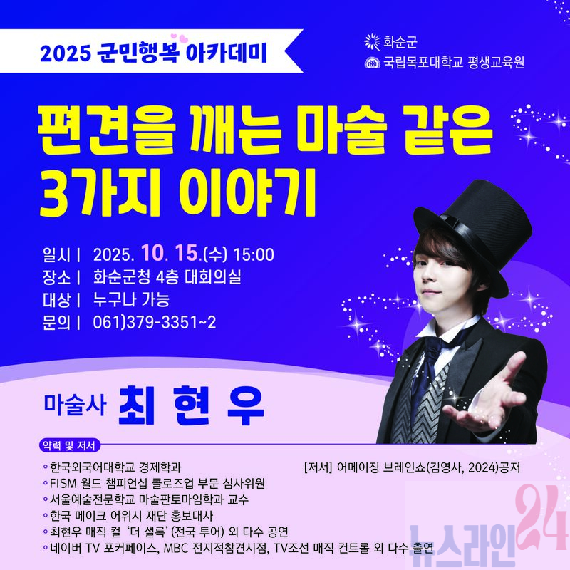화순군(군수 구복규)은 오는 10월 15일(수) 오후 3시, 화순군청 4층 대회의실에서 '2025 군민행복 아카데미 8회차 강연을 개최한다고 밝혔다.