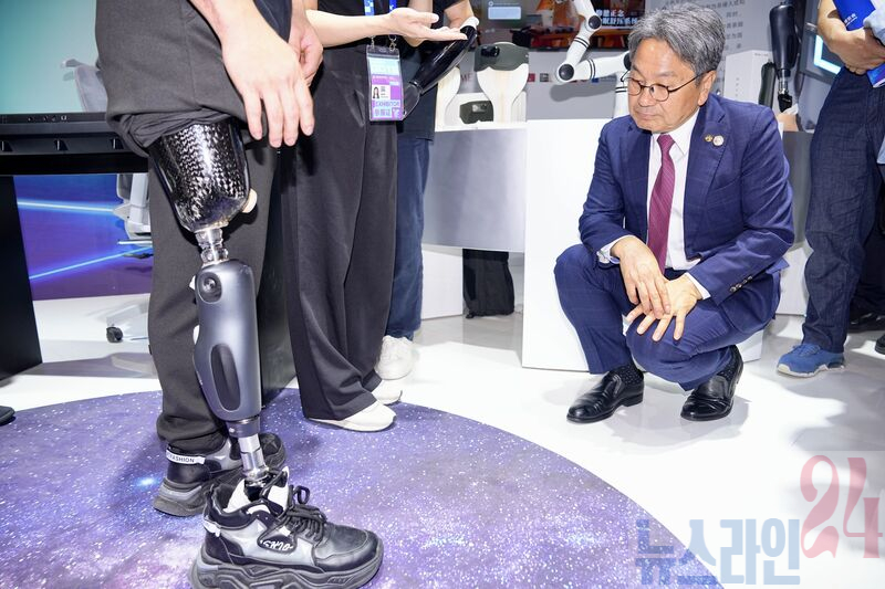 강기정 광주광역시장이 25일(현지시간) 오후 중국 항저우 그랜드컨벤션센터에서 열린 ‘제4회 항저우 디지털 무역 박람회’에서 중국 ‘육소룡’ 중 하나인 뇌-컴퓨터 인터페이스 기업 ‘브레인코’ 부스를 찾아 스마트 의족·의수를 착용한 직원들과 함께 기술에 대해 논의하고 있다.