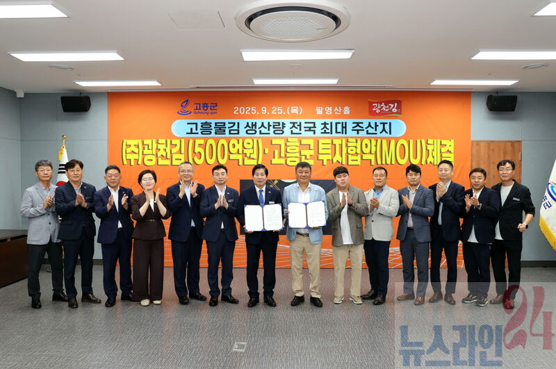 고흥군(군수 공영민)은 지난 25일 군청 팔영산홀에서 국내 김 산업 선도기업인 ㈜광천김(대표 김재유)과 500억 원 규모의 민간개발 투자협약(MOU)을 체결했다고 밝혔다.