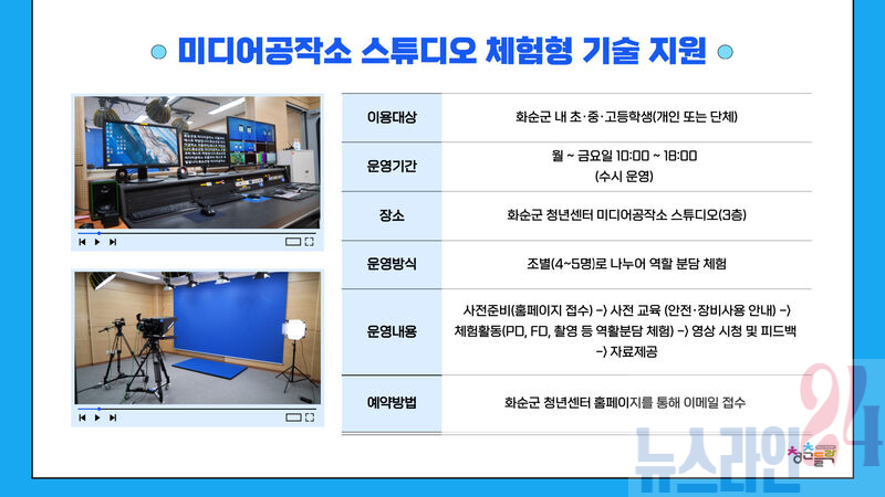 화순군(군수 구복규)은 청소년들의 창의적 활동을 지원하고 진로 탐색의 기회를 제공하기 위해 화순군 청년센터 미디어공작소 스튜디오를 무료로 개방, 체험형 기술 지원 프로그램을 운영하고 있다고 26일 밝혔다.