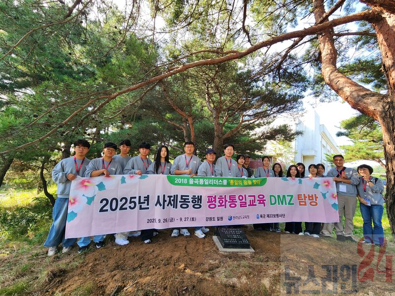 전라남도교육청(교육감 김대중)은 26~27일 강원도 고성군 일원에서 ‘사제동행 평화통일 DMZ탐방’을 운영했다. 이번 DMZ탐방에는 2018년 ‘율곡통일리더스쿨’ 프로그램에 참여했던 학생과 운영추진단 20여 명이 함께해, 7년 전 타임캡슐을 묻었던 율곡부대를 다시 찾았다.