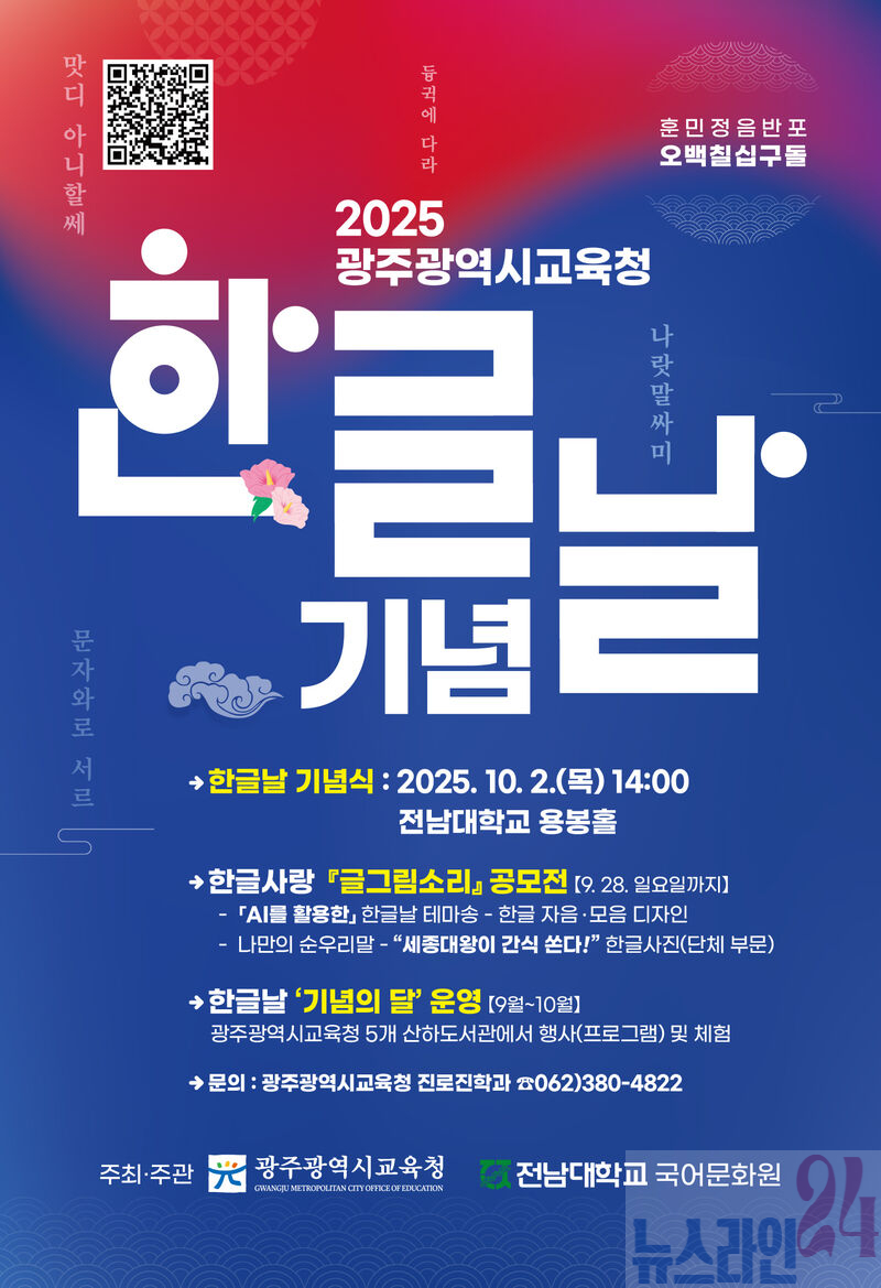 시교육청은 오는 10월 2일 전남대 용봉홀에서 전남대학교와 공동으로 ‘579돌 한글날 기념식’을 개최한다. 이날 기념식은 이정선 교육감과 이근배 전남대 총장 등이 참석한 가운데 훈민정음 해례본 낭독, 한글 발전 유공장 포상, 축하공연 순으로 열린다.