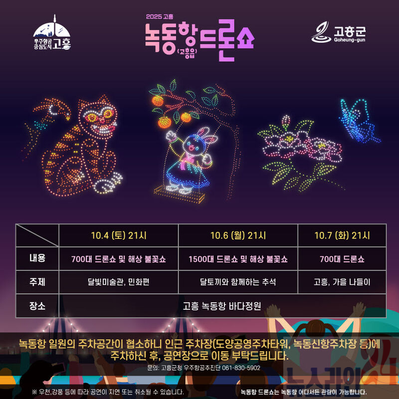 고흥군 녹동항 드론쇼는 오는 10월 25일 폐막식을 앞두고 있으며 강우, 강풍 등 기상 여건에 따라 일정이 변경될 수 있다.
