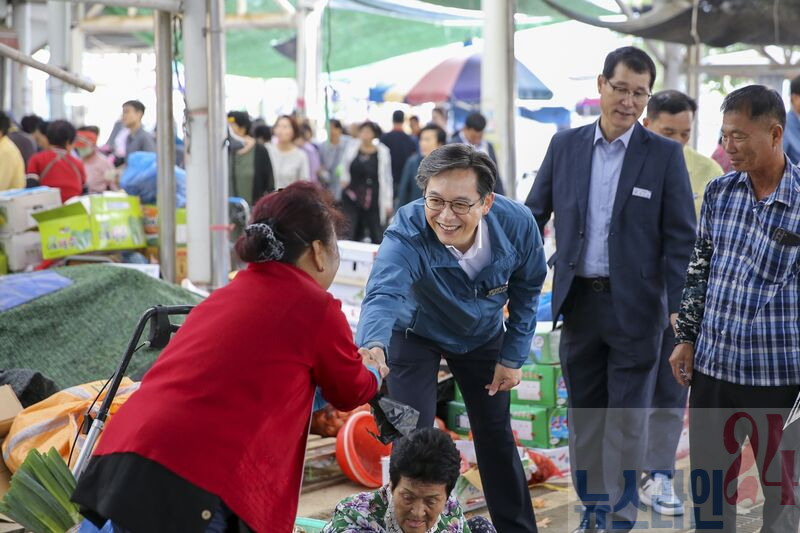 우승희 영암군수가 30일 추석을 앞두고 영암5일시장 등 전통시장가 상가 등 민생 현장을 찾아 장바구니 물가동향을 살피고, 명절을 맞은 소상공인의 어려움과 장을 보러 온 영암군민의 이야기를 들었다.