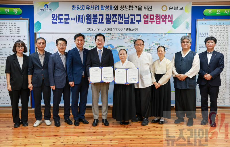 완도군(군수 신우철)이 완도 해양치유산업 활성화를 위해 (재)원불교 광주전남교구(교구장 오은도)와 업무 협약을 체결했다.