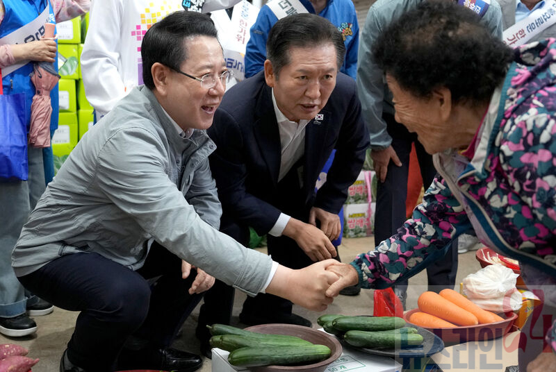 정청래 더불어민주당 대표와 김영록 전라남도 도지사가 추석명절을 앞둔 3일 구례5일장을 방문, 민생현장을 둘러보며 주민 및 상인들을 격려하고 있다.
