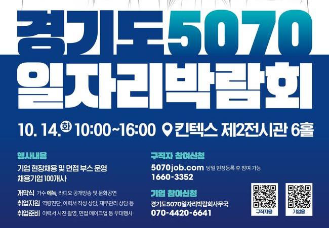 경기도가 중장년층의 재도약을 지원하기 위해 오는 14일 고양 킨텍스에서 ‘경기도 5070 일자리 박람회’를 연다.